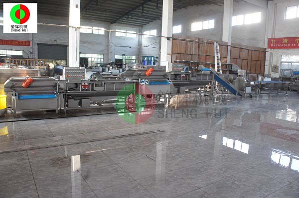其中一條生產(chǎn)線是(氣泡洗菜機(jī)預(yù)浸泡--6人分選--切割--提升--純氧源高濃臭氧混合渦流洗菜機(jī)清洗--紅外線殺毒和預(yù)制冷保鮮二級(jí)渦流洗菜機(jī)清洗--脫水)。