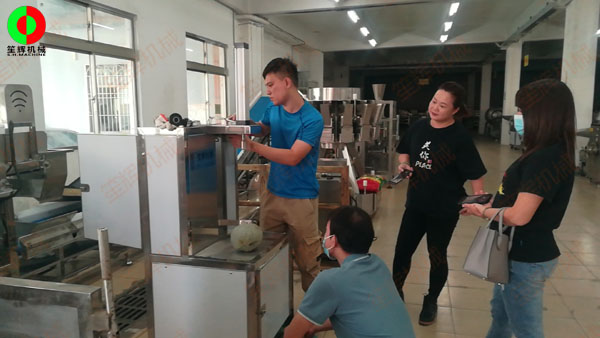中山市某公司一行人親臨我司考察洽談,測試削皮機等定制食品加工機械!一切為了客戶,笙輝機械致力于打造全國具有競爭力的食品前處理自動化加工機械企業。