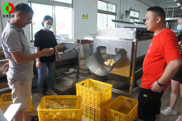 連續式土豆去皮機針對客戶帶來的大批土豆現場進行加工處理測試,提升機自動上料,螺旋自動送料出料,時產4頓,物料處理效果令來自中山的客戶非常滿意!
