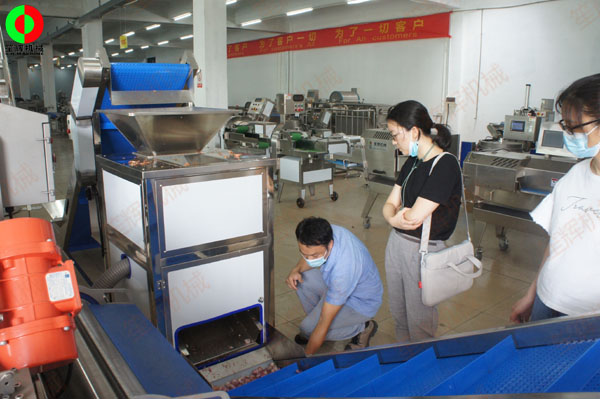 惠州客戶王小姐親臨我司測試洋蔥脫皮及切碎設(shè)備!
