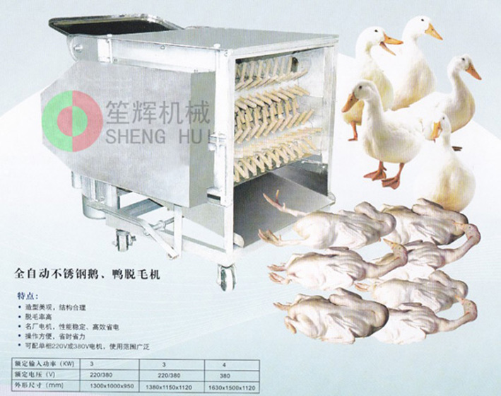- 產品優勢: 大型自動脫毛機,采用不銹鋼制造,耐磨耐用,采用大功率電機,適合于大量的家禽脫毛,產量大,效率高,特別適合鵝鴨的脫毛。結構合理,性能穩定,省電,操作簡單,清洗方便,脫毛率高,脫毛效果好,適合大型家禽處理廠,家禽養殖加工場等使用。